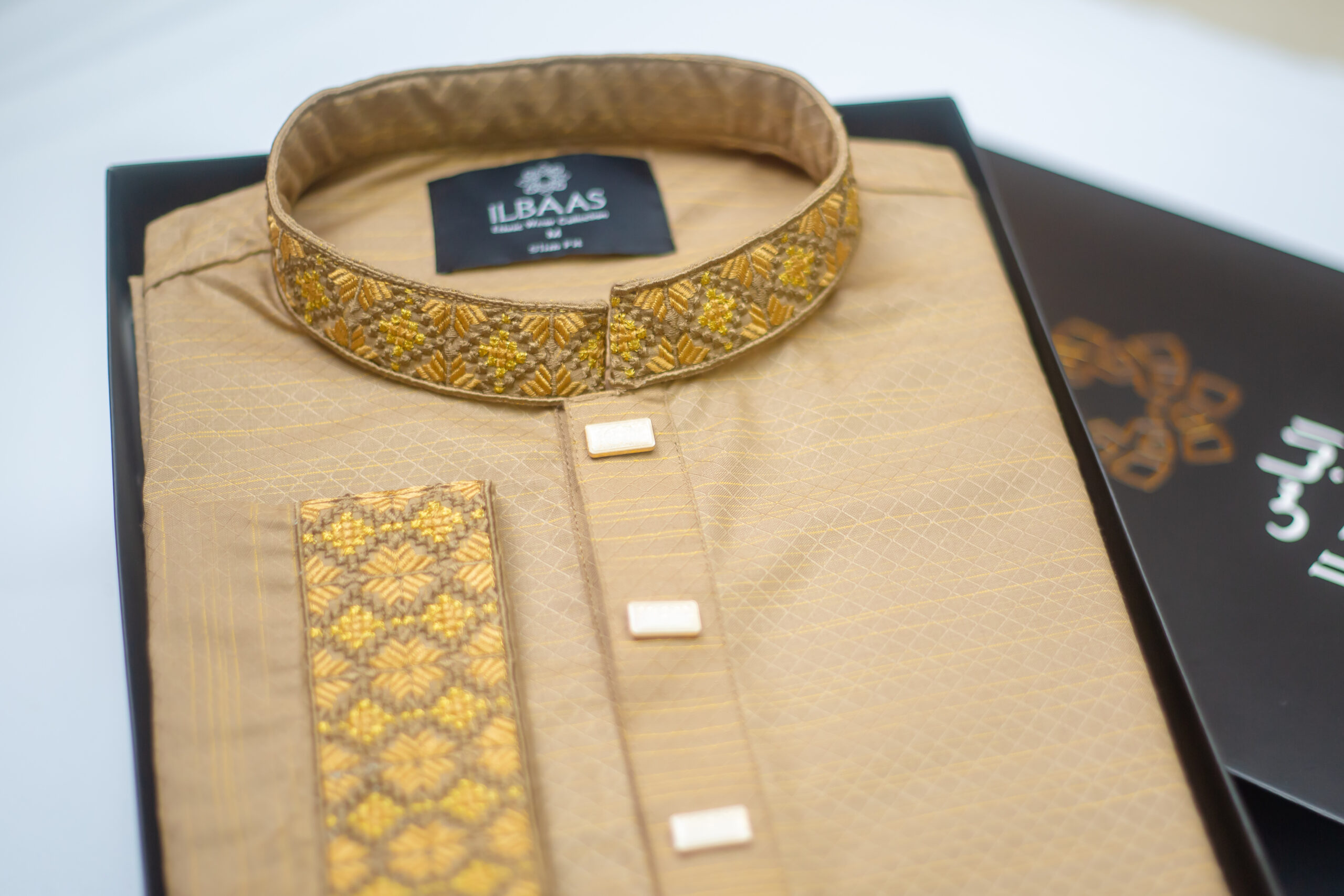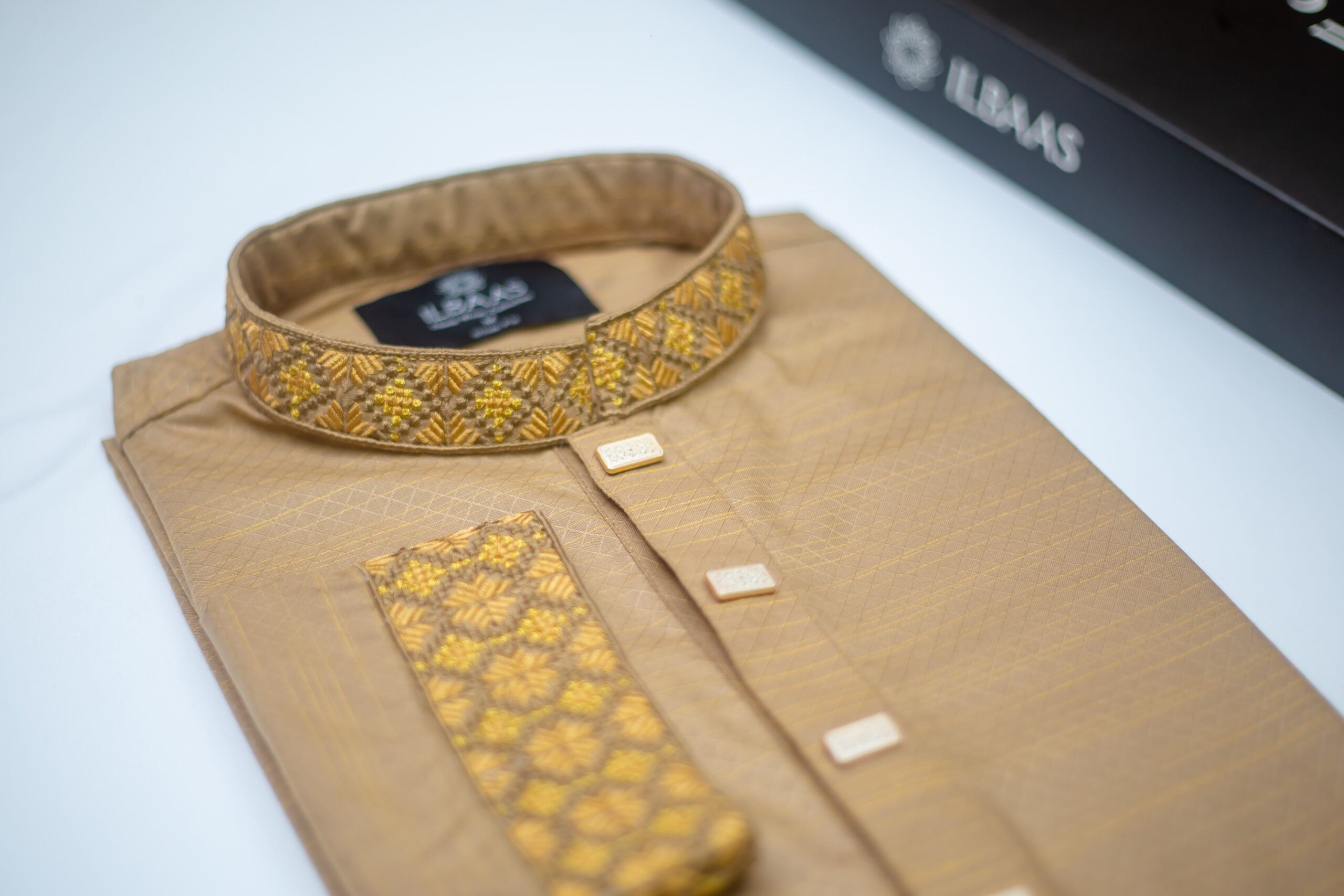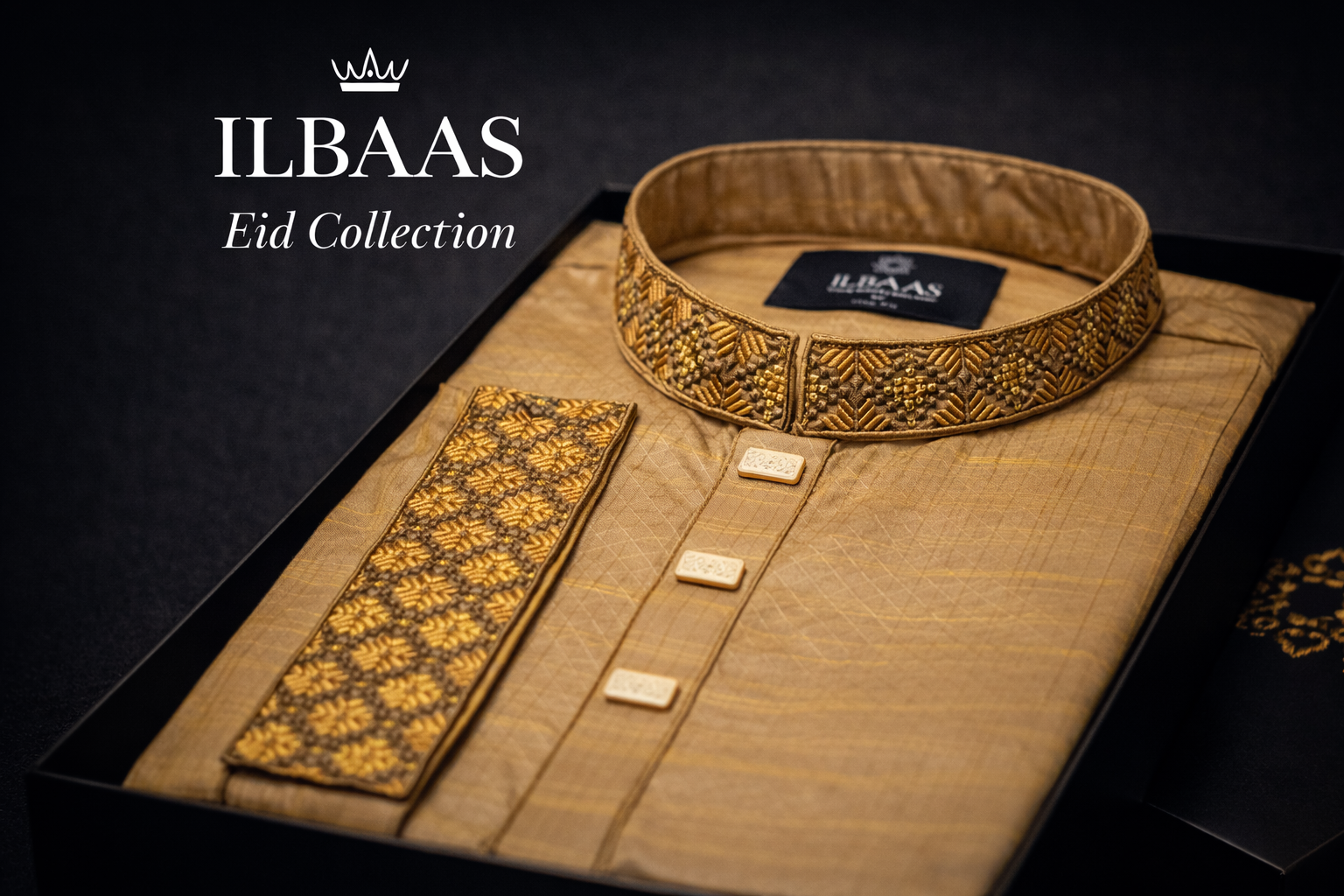 Experience luxury and tradition with this elegant golden jacquard Punjabi from the ILBAAS Eid Collection. Crafted with premium fabric and intricate embroidery, this piece reflects refined craftsmanship and festive sophistication.