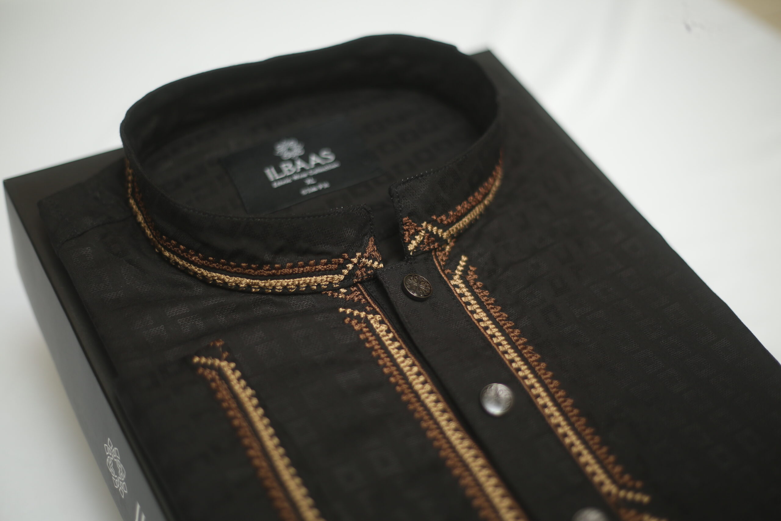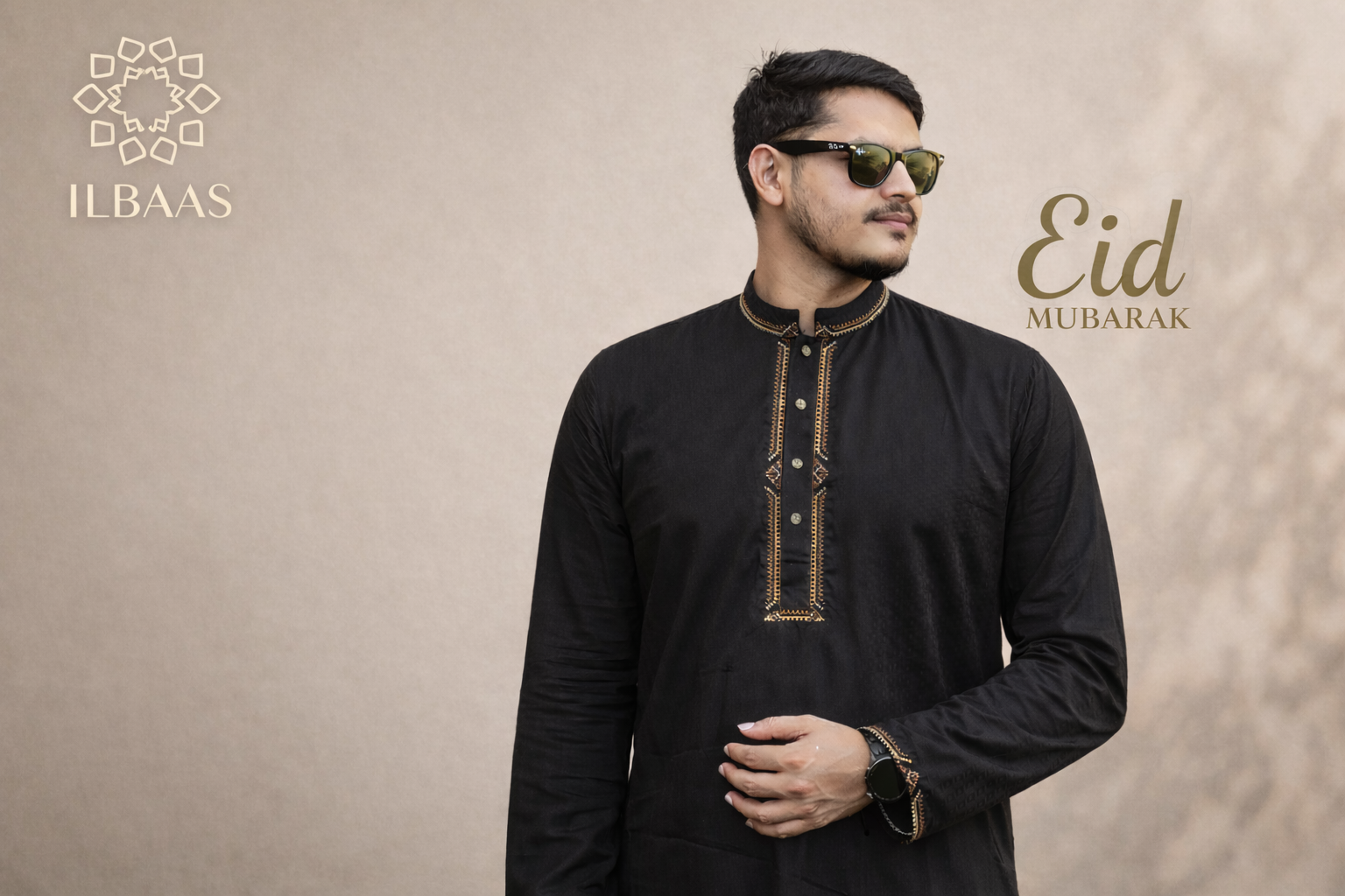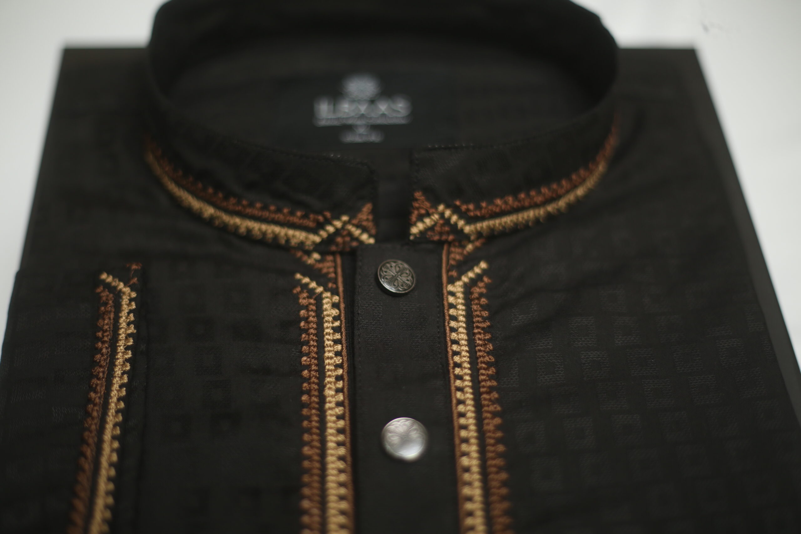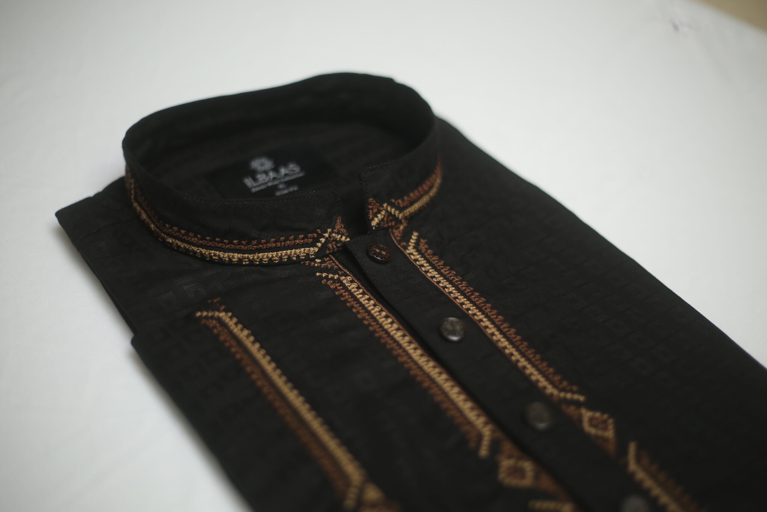 Premium black Punjabi crafted from Indian Jacquard fabric, featuring elegant contrast embroidery on the placket and cuffs for a sophisticated festive look. Designed with a modern comfortable fit, perfect for Eid celebrations, evening events, and special occasions.