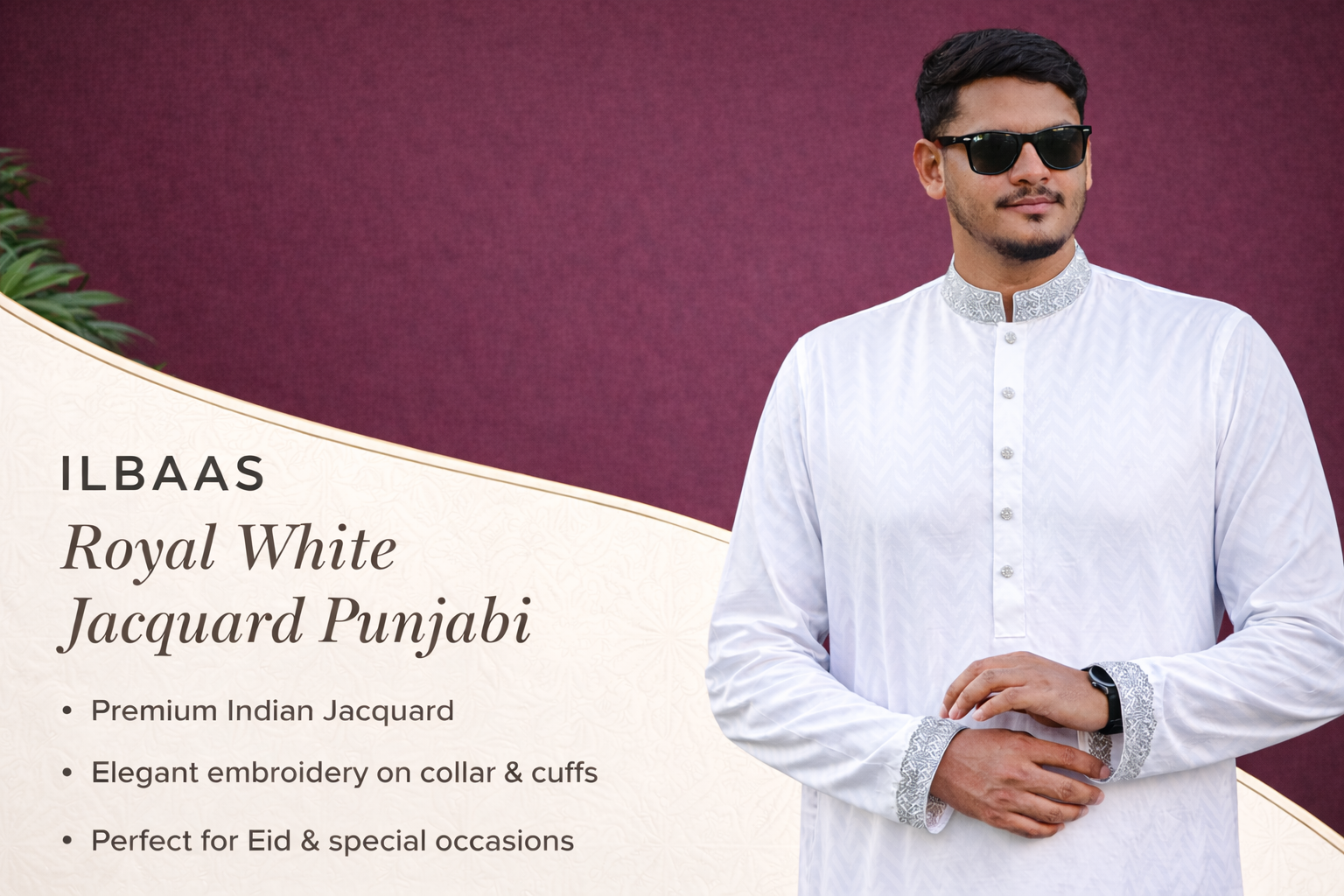Elegant white Punjabi crafted from premium Indian Jacquard fabric, featuring subtle woven patterns with refined embroidery on the collar and cuffs. Designed with a modern comfortable fit, perfect for Eid, festive occasions, and traditional gatherings.