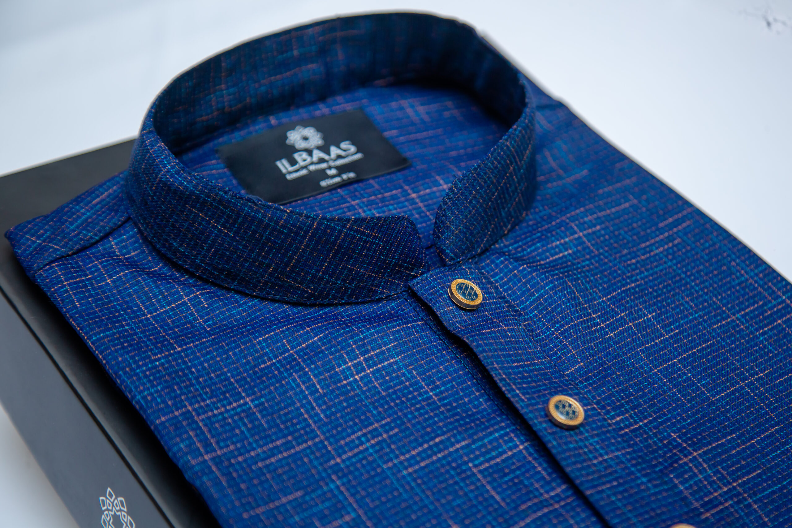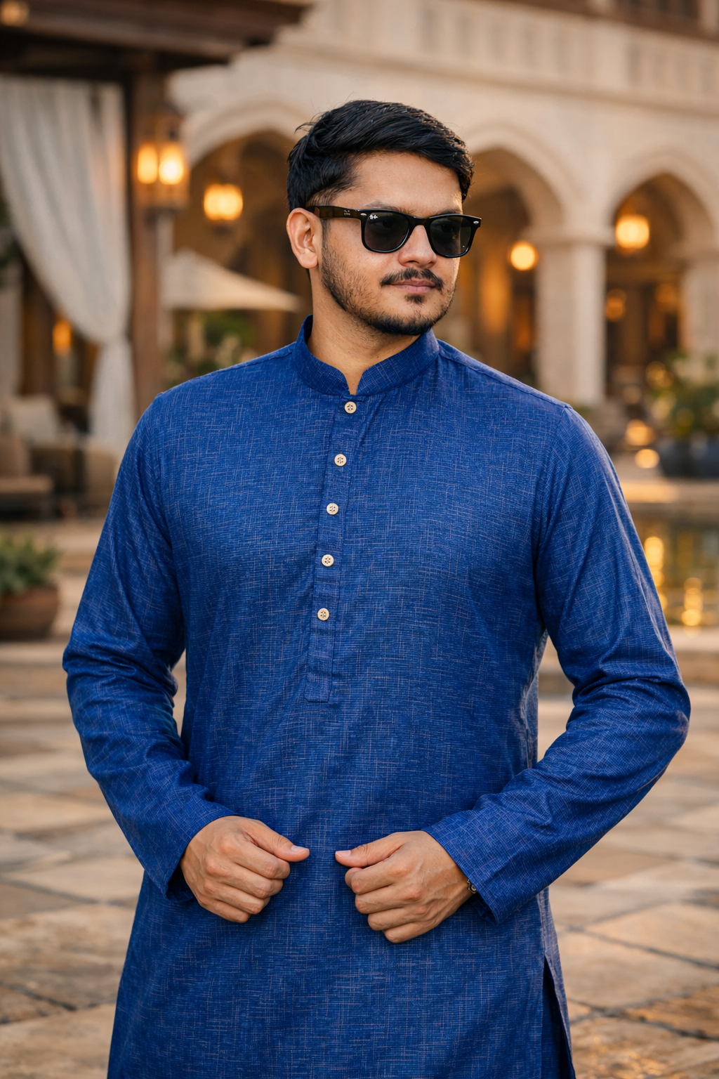 Elevate your ethnic wardrobe with this elegant royal blue textured kurta, designed for modern men who appreciate refined tradition. Crafted from a premium lightweight fabric, this kurta features a subtle woven texture that adds depth and sophistication to its rich blue tone. The classic mandarin collar and buttoned placket enhance its timeless appeal, while the clean tailoring ensures a comfortable and flattering fit.